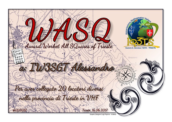 Carissimi colleghi vi presento il nuovo diploma WASQ Trieste (Worked All SQuares). Per ottenerlo sarā necessario collegare o attivare 20 (venti) locator nella provincia di Trieste durante le attivitā SOTA TS e/o TAW.